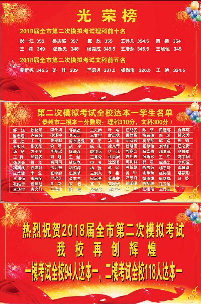 2015年翟傈(386分A+A,无锡宜兴人)荣获泰州市理科复读生高考状元,已被南京大学签约录取;张勉(375分AA+,镇江丹阳人)荣获泰州市文科复读生高考状元,已被东南大学签约录取。2014年唐忠(泰州海陵区人,388A+A+)再次夺得泰州市复读生高考状元(全省第二名),被南京大学录取,蒋哲鑫(无锡宜兴人,383AA)被浙江大学录取,王艳(扬州高邮人,378AA)被南京航空航天大学录取。2013年理科考生蒋海鑫(无锡人)提高114分,文科考生王国栋(南京高淳人)提高80分,荣获江苏省作文满分状元。 2012年高考获得大面积丰收,何恬(扬州广陵区人)语文附加题满分,成为全省语文附加题高考状元;2011年陈立(苏州市甪直镇人,384分AA)被南京大学录取;2010年袁雅云(泰州市区莲花四区人)以413分AA+荣获江苏省复读生高考状元,成为中国人民大学的高才生; 2009年汤天池(兴化市周庄镇人,393分A+A+)被南京大学录取,华宇飞(无锡华士镇人,390分AA)被东南大学录取; 2008年李丽(扬州市高邮横泾镇人,403 分A+A+)荣获泰州市复读生高考状元(省第二名),陈悦(镇江市区石头巷人,400分A+A+)获得省第三名,她们均被南京航空航天大学录取,本硕连读; 2007年陶海燕(扬州市高邮横泾镇人,688分)被清华大学录取;